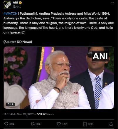 બોલીવૂડ એક્ટ્રેસ અને વિશ્વ સુંદરી ઐશ્વર્યા રાય-બચ્ચન આજે આંધ્રપ્રદેશના પુટ્ટપર્થીમાં દિવંગત અધ્યાત્મિક ગુરુ શ્રી સત્ય સાઈ બાબાના જન્મ શતાબ્દી સમારોહમાં સામેલ થઈ હતી. દેશના વડા પ્રધાન નરેન્દ્ર મોદી પણ આ ઈવેન્ટમાં હાજર હતા અને એ સમયનો એક વીડિયો સોશિયલ મીડિયા પર વાઈરલ થઈ રહ્યો છે.