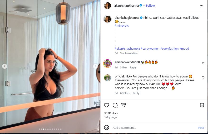 આકાંક્ષાએ પોતાના ફોટો એકાઉન્ટ પર શેર કરતાં કેપ્શનમાં લખ્યું હતું કે ફરી પાછી એ જ સેલ્ફ ઓબ્સેશનવાળી સમસ્યા… આકાંક્ષાનું સોશિયલ મીડિયા એકાઉન્ટ આવા જ હોટ, સિઝલિંગ અને રીવિલિંગ ફોટોઝથી ભર્યું પડ્યું છે. જોકે, ઘણી વખત આકાંક્ષાને આને કારણે ટ્રોલિંગનો સામનો પણ કરવો પડે છે.
