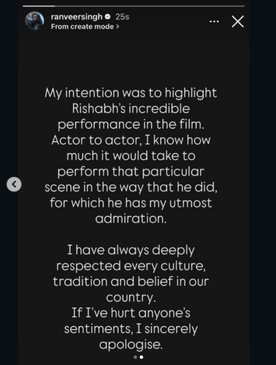વિવાદિત વીડિયો વાયરલ થયા પછી, રણવીર સિંહે સોશિયલ મીડિયા પર એક પોસ્ટ દ્વારા માફી માંગી હતી. “મારો હેતુ ફિલ્મમાં ઋષભના શાનદાર અભિનયને પ્રકાશિત કરવાનો હતો. એક અભિનેતા તરીકે, હું જાણું છું કે તે ચોક્કસ દ્રશ્યને તે રીતે ભજવવામાં કેટલો સમય લાગે છે, જેના માટે હું તેનો ખૂબ પ્રશંસક છું. મને હંમેશા મારા દેશની દરેક સંસ્કૃતિ, પરંપરા અને માન્યતા પ્રત્યે ખૂબ આદર રહ્યો છે. જો મેં કોઈની લાગણીઓને ઠેસ પહોંચાડી હોય, તો હું દિલથી માફી માંગુ છું.”
