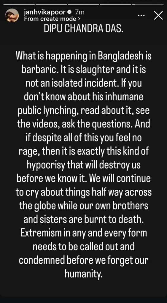 જયારે તેની બાદ જાહ્નવી કપૂરે પણ ઇન્સ્ટાગ્રામ સ્ટોરી શેર કરી છે. તેમજ બાંગ્લાદેશમાં હિંદુઓ પરના હુમલાઓને અમાનવીય ગણાવી હતી. જાહ્નવીએ લખ્યું કે કોઈપણ પ્રકારની હિંસા અને કટ્ટરતાનો વિરોધ કરવો મહત્વપૂર્ણ છે. નહીં તો સમાજ તેની માનવતા ગુમાવી દેશે. જાહ્નવી કપૂરે એમ પણ કહ્યું કે વિશ્વના કોઈપણ ભાગમાં નફરત અને હિંસા માટે કોઈ સ્થાન ન હોવું જોઈએ. જાહ્નવીની પોસ્ટની સોશિયલ મીડિયા પર પ્રશંસા થઈ રહી છે.