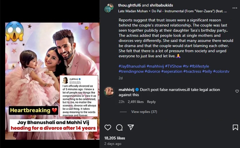 જોકે આ બધી વાત ખોટી સાબિત થઈ છે. આવા ખોટા રિપોર્ટથી કંટાળી અભિનેત્રી માહી વિજે પોતાના ઈન્સ્ટાગ્રામ અકાઉન્ટ પર એક પોસ્ટ મૂકી છે. thou.ghtful6 નામના એકાઉન્ટ પર બન્નેના છૂટાછેડાની ખબર આપતી પોસ્ટ વાયરલ થઈ હતી. માહીએ તે પોસ્ટને રિ-પોસ્ટ કરી લખ્યું છે કે ખોટી ખબરો ફેલાવવાનું બંધ કરો. આવી પોસ્ટ સામે હું કાનૂની કાર્યવાહી કરીશ.