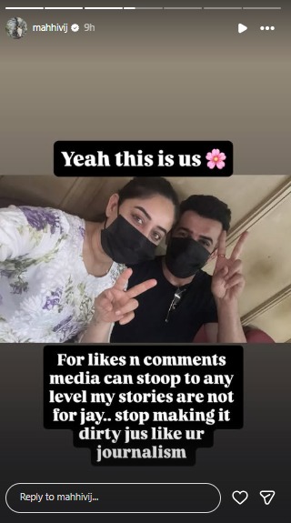 વાત જાણે એમ છે કે માહીએ જય સાથેની એક સેલ્ફી શેર કરી હતી અને આ ફોટોમાં બંને જણે માસ્ક પહેર્યો છે. જય અને માહી પીસની સાઈન બનાવી રહ્યા છે. માહીએ આ સ્ટોરીની કેપ્શનમાં લખ્યું હતું કે હા, આ અમે છીએ. લાઈક્સ અને કમેન્ટ્સ માટે મીડિયા કોઈ પણ હદ સુધી નીચે જઈ શકે છે. મારી સ્ટોરીઝ જય માટે નથી.