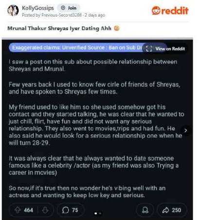 રેડિટની પોસ્ટમાં દાવો કરવામાં આવ્યો હતો કે શ્રેયસ ઐયર અને મૃણાલ થોડા મહિનાઓથી ડેટિંગ કરી રહ્યા છે અને હજુ પણ બંને રિલેશનમાં છે. પોસ્ટમાં એમ પણ કહેવામાં આવ્યું હતું કે તેઓ આ બાબત જાહેર કરવા માંગતા નથી, કારણ કે ક્રિકેટ ચાહકો ઘણીવાર ખૂબ જ ઉગ્ર બની શકે છે.