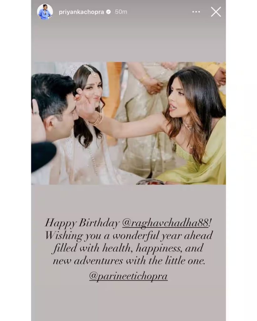પ્રિયંકા ચોપ્રાએ પોતાના ઓફિશિયલ ઈન્સ્ટાગ્રામ એકાઉન્ટ પર સ્ટોરી શેર કરી છે. પીસીએ સ્ટોરી પર રાઘવનો એક ક્યુટ ફોટો શેર કર્યો છે. આ ફોટો પરિણીતી અને રાઘવ ચઢ્ઢાની સગાઈ સમયનો છે. આ ફોટોમાં પીસી રાઘવ જીજુને તિલક લગાવતી જોવા મળે છે. આ ફોટો સાથે ખાસ મેસેજ લખતાં તેણે લખ્યું હતું કે હેપ્પી બર્થડે રાઘવ… તારું વર્ષ ખુશીઓ, હેપ્પી અને લિટલ વન સાથે એડવેન્ચરથી ભરપૂર હોય.
