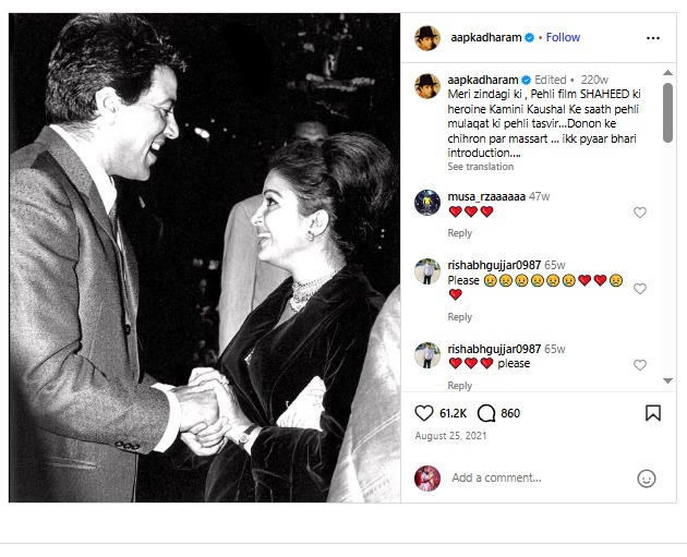 અત્રે ઉલ્લેખનીય છે કે દિગ્ગજ અભિનેતા અને હી-મેન ધર્મેન્દ્રનાં પહેલાં કો-સ્ટાર હતા આ કામિની કૌશલ ધર્નેમ્દ્રએ સોશિયલ મીડિયા પર પોસ્ટ કરીને આ વાતની જાણકારી શેર કરી હતી. તેમણે લખ્યું હતું કે મારા જીવનની પહેલી ફિલ્મ શહીદની હિરોઈન કામિલી કૌશલ સાથે પહેલી મુલાકાતની પહેલી તસવીર. બંનેના ચહેરાં પર સ્માઈલ અને એક પ્રેમાળ ઈન્ટ્રોડક્શન…
