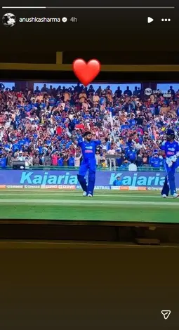 અનુષ્કા શર્માએ ઈન્સ્ટાગ્રામ પર સ્ટોરીમાં વિરાટ કોહલીનો એક ફોટો શેર કર્યો છે. આ ફોટોમાં વિરાટ બ્લ્યુ જર્સીમાં જોવા મળી રહ્યો છે અને તેના એક હાથમાં બેટ અને બીજા હાથમાં હેલ્મેટ છે. આ ફોટો વિરાટે સદી ફટકારી એ સમયનો છે. અનુષ્કાએ આ ફોટો સાથે એક હાર્ટનું ઈમોજી પણ શેર કર્યું છે. અનુષ્કાની આ પોસ્ટ સોશિયલ મીડિયા પર વાઈરલ થઈ રહી છે.