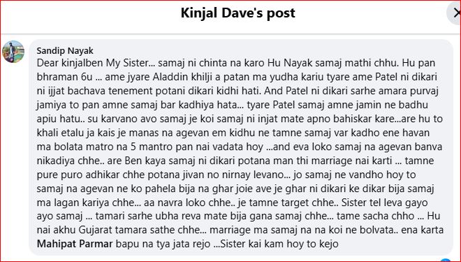સંદીપ નાયકે લખ્યું, વહાલી બહેન કિંજલ, સમાજની ચિંતા ના કરશો. હું નાયક સમાજમાંથી છું અને હું પણ બ્રાહ્મણ છું. જ્યારે અલાઉદ્દીન ખીલજીએ પાટણ પર યુદ્ધ કર્યું ત્યારે અમે પટેલની દીકરીની ઈજ્જત બચાવવા તેમને પોતાની દીકરી કહી હતી. અને પટેલની દીકરી સાથે અમારા પૂર્વજો જમ્યા તો પણ અમને સમાજ બહાર કાઢ્યા હતા… ત્યારે પટેલ સમાજે અમને જમીન અને બધું આપ્યું હતું. શું કરવાનું એવા સમાજનું જે કોઈ સમાજની ઈજ્જત માટે આપણો બહિષ્કાર કરે? અરે, હું તો ખાલી એટલું જ કહીશ કે જે માણસે (આગેવાને) એમ કહ્યું ને કે તમને સમાજ બહાર કાઢો, એને હવનમાં બોલાતા માત્ર 5 મંત્રો પણ નહીં આવડતા હોય… અને એવા લોકો સમાજના આગેવાન બનવા નીકળ્યા છે. અરે બહેન, કયા સમાજની દીકરી પોતાના મનથી લગ્ન નથી કરતી? તમને પૂરેપૂરો અધિકાર છે પોતાના જીવનનો નિર્ણય લેવાનો. જો સમાજને વાંધો હોય તો સમાજના આગેવાનને કહો કે પહેલા બીજાના ઘર જોઈ આવે કે જે ઘરની દીકરી કે દીકરાએ બીજા સમાજમાં લગ્ન કર્યા છે. આ નવરા લોકો છે જે તમને ટાર્ગેટ કરે છે. બહેન, તેલ લેવા ગયો એવો સમાજ… તમારી સાથે ઉભા રહેવા માટે બીજા ઘણા સમાજ છે. તમે સાચા છો… હું જ નહીં આખું ગુજરાત તમારી સાથે છે. લગ્નમાં સમાજના કોઈને ના બોલાવતા, એના કરતા મહિપત પરમાર બાપુના ત્યાં જતા રહેજો… બહેન, કંઈ કામ હોય તો કહેજો.