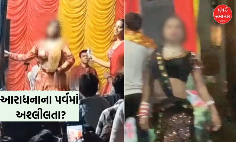 વાયરલ વીડિયો મુજબ કાળા રંગના ડ્રેસ પહેરેલી એક યુવતી માતાજીની મૂર્તિ સામે અશ્લીલ ડાન્સ કરતી હતી. આશ્ચર્યજનક રીતે તેની બાજુમાં બે લોકો ચૂંદડી ઓઢીને ભક્તિભાવપૂર્વક નૃત્ય કરી રહ્યા હતા. ત્યારે આ યુવતીનું નૃત્ય ધાર્મિક વાતાવરણને લજવતું સ્પષ્ટ દેખાઈ રહ્યું છે. અન્ય એક વીડિયોમાં રંગીન રોશનીથી સજાવેલા સ્ટેજ ઉપર યુવતીઓ બિભત્સ નાચગાન કરી રહી છે અને આ દ્રશ્યો જોવા માટે લોકોના ટોળેટોળા એકઠા થયા હતા.