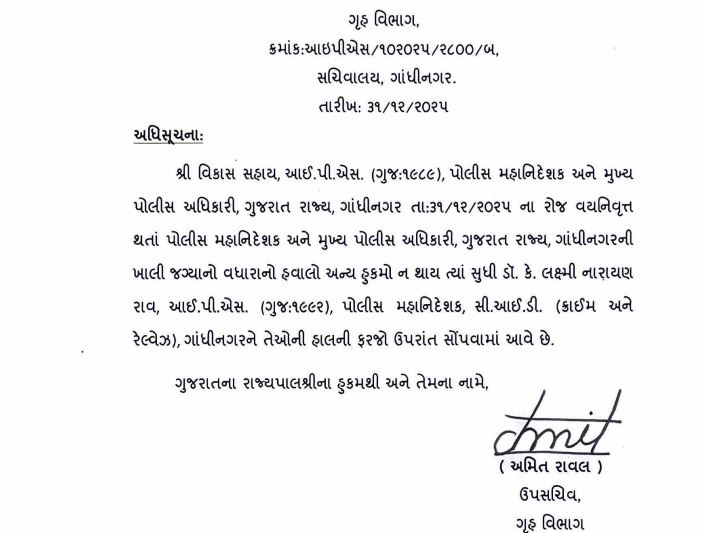 ગાંધીનગર: 1989ની બેચના આઈપીએસ વિકાસ સહાય આજે ગુજરાતના ડીજીપીના પદેથી નિવૃત્ત થયા છે. સરકારે પણ તેઓને નિવૃત્ત જાહેર કરી દીધા છે. જોકે, હજુ પણ ગુજરાતને હજુ પણ કાયમી ડીજીપી મળ્યા નથી. કારણ કે, વિકાસ સહાયની નિવૃત્તિ બાદ હવે ડૉ. કે.એલ.એન. રાવને ગુજરાતના ઇન્ચાર્જ ડીજીપી બનાવવામાં આવ્યા છે.