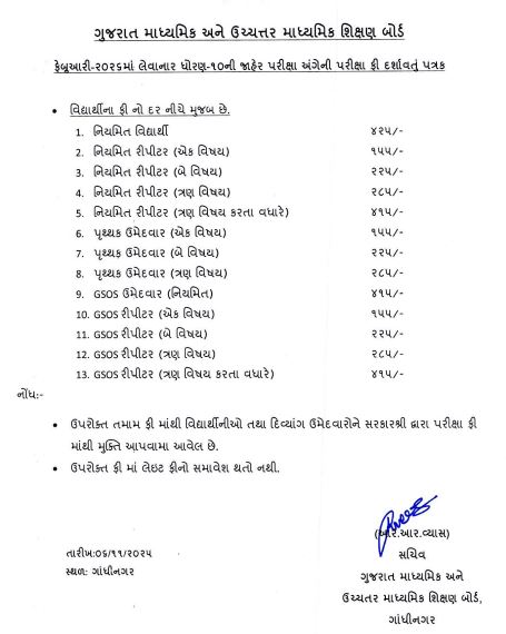 વધારે વિગતે વાત કરવામાં આવે તો ધોરણ 10 અને 12માં કેટલાક વિદ્યાર્થીઓ જે નાપાસ થયા હોય તેઓ ફરી પરીક્ષા આપતા હોય છે. જો ધોરણ 10ના રીપીટર વિદ્યાર્થીઓએ એક વિષયની પરીક્ષા માટે 155 રૂપિયા, બે વિષયની પરીક્ષા માટે 255 રૂપિયા, ત્રણ વિષયની પરીક્ષા માટે 385 રૂપિયા અને ત્રણથી વધારે વિષયની પરીક્ષા આપવા માટે 415 રૂપિયા ફી ભરવાની રહેશે. આ સમગ્ર માહિતી ગુજરાત માધ્યમિક અને ઉચ્ચતર માધ્યમિક શિક્ષણ બોર્ડ દ્વારા સત્તાવાર વેબસાઈટ પર શેર કરી દેવામાં આવી છે.