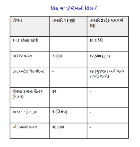 ‘વિશ્વાસ’ પ્રોજેક્ટ વિશ્વાસનો હેતુ રાજ્યમાં સુરક્ષાનું મજબૂત નેટવર્ક ઊભું કરવાનો છે. આ પ્રોજેક્ટ હેઠળ, અત્યાર સુધીમાં રાજ્યના 54 શહેરોમાં 12,500 થી વધુ સીસીટીવી કેમેરા લગાવવામાં આવ્યા છે, ‘વિશ્વાસ’ પ્રોજેક્ટમાં ગુજરાત અને અન્ય રાજ્યો વચ્ચેના 79 ઇન્ટરસ્ટેટ ચેકપોઇન્ટ પણ આવરી લેવામાં આવ્યા છે. પ્રથમ તબક્કામાં, 7,000 સીસીટીવી કેમેરા લગાવવામાં આવ્યા હતા. જેનાથી દેખરેખ, ગુના નિયંત્રણ અને તપાસમાં મદદ મળશે.’વિશ્વાસ’ પ્રોજેક્ટના પહેલા અને બીજા તબક્કાની વિગતો નીચે આપેલા કોષ્ટકમાં આપેલી છે.
