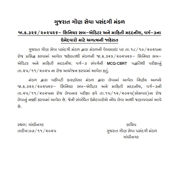 માહિતી અને પ્રસારણ વિભાગ/માહિતી નિયામક કચેરી હસ્તકની સિનિયર સબ એડિટર અને માહિતી મદદનીશ વર્ગ 3ની પ્રાથમિક પરીક્ષાની તારીખ ગુજરાત ગૌણ સેવા પસંદગી મંડળ દ્વારા જાહેર કરવામાં આવી હતી. ગૌણ સેવા પસંદગી મંડળની જાહેરાત અનુસાર આગામી 25 નવેમ્બરના રોજ સિનિયર સબ એડિટર અને માહિતી મદદનીશ વર્ગ 3ની પ્રાથમિક પરીક્ષા યોજવાની હતી. જો કે હવે મંડળ દ્વારા વહીવટી કારણોસર ફેરફાર કરવામાં આવ્યો છે અને હવે આ પરીક્ષા આગામી 15-12-2025 (સોમવાર) યોજાશે.