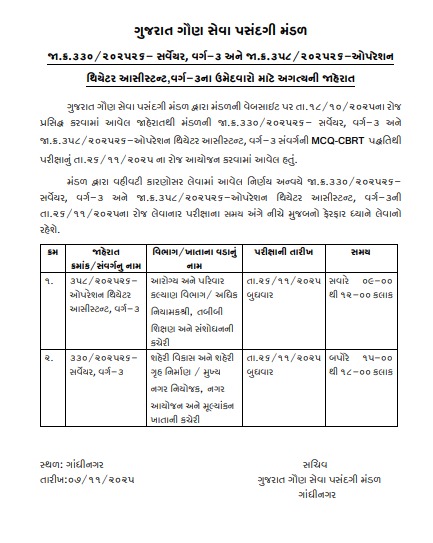 તે ઉપરાંત આરોગ્ય અને પરિવાર કલ્યાણ વિભાગ અને અધિક નિયામક, તબીબી શિક્ષણ અને સંશોધનની કચેરી હસ્તકની ઓપરેશન થિયેટર આસિસ્ટન્ટની પરીક્ષા 26-11-2025ના રોજ સવારે 9થી 12 વાગ્યાના સમયે યોજાશે. તેમજ શહેરી વિકાસ અને શહેરી ગૃહ નિર્માણ / મુખ્ય નગર નિયોજક, નગર આયોજન અને મૂલ્યાંકન ખાતાની કચેરી હસ્તકની સર્વેયરની પરીક્ષા 26-11-2025ના રોજ બપોરે 3 વાગ્યાથી 6 વાગ્યાના સમયે યોજાશે.