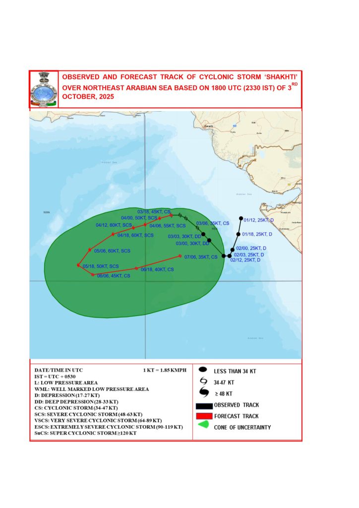 હવામાન વિભાગના જણાવ્યા અનુસાર, ઉત્તર-પૂર્વ અરબ સાગરમાં વાવાઝોડું ‘શક્તિ’ સર્જાઈ ગયું છે. વિભાગે અરબ સાગરમાં ભારે પવન ફૂંકાવવા સહિત સમુદ્રમાં ઊંચા મોજા ઉછળવાને લઈને ચેતવણી આપી હતી. અરબ સાગરમાં 55-65 કિલોમીટર પ્રતિ કલાકની ઝડપે હવાનું જોર વધ્યું છે, જે વધીને 75 કિલોમીટર પ્રતિ કલાક સુધી થઈ શકે છે. જેમાં 3 ઑક્ટોબરની સાંજે હવાનું દબાણ 75-85 કિ.મી. પ્રતિ કલાક થવાની સંભાવના છે. 4 ઑક્ટોબરની સાંજથી 6 ઓક્ટોબરની સવાર સુધી આ સાયક્લોનિક વધુ સક્રિય થઈ શકે છે. આ દરમિયાન 100-110 કિ.મી. પ્રતિ કલાક સુધી ભારે પવન ફૂંકાવવાની શક્યતા છે. તેમજ 125 કિ.મી. પ્રતિ કલાકની પવનની ઝડપે જઈ શકે છે.