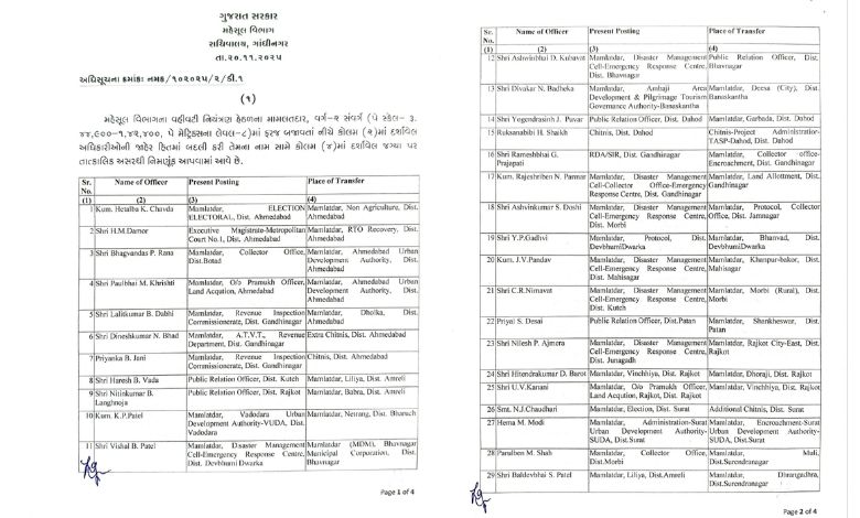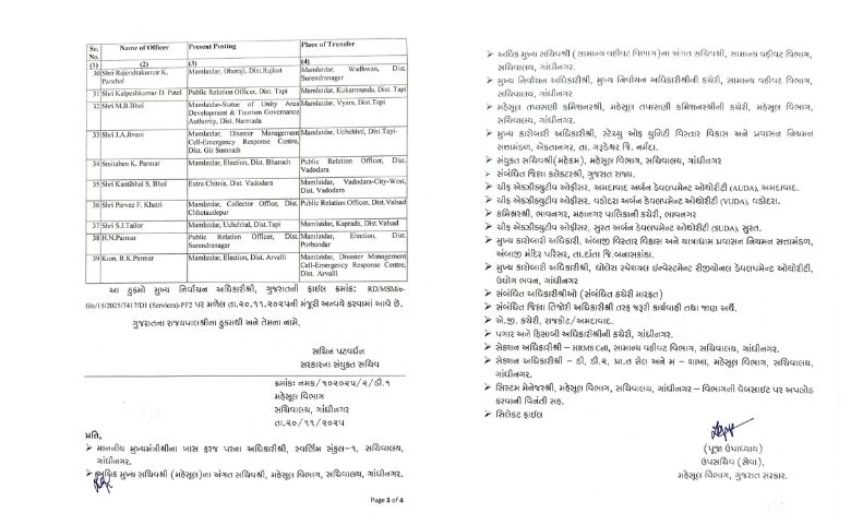 મહેસૂલ વિભાગ દ્વારા બહાર પાડવામાં આવેલા સત્તાવાર આદેશ મુજબ, આ તમામ અધિકારીઓને તેમના હાલના કાર્યસ્થળ પરથી તાત્કાલિક અસરથી મુક્ત કરીને તેમને નામ સામે દર્શાવેલા નવા સ્થળે નિમણૂક આપવામાં આવી છે.