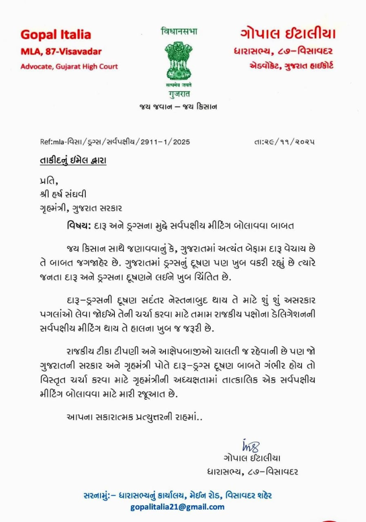 વિસાવદરના ધારાસભ્ય ગોપાલ ઈટાલીયાએ પોતાના પત્રમાં લખ્યું છે કે, “રાજકીય ટીકા-ટીપ્પણી અને આક્ષેપબાજીઓ ચાલતી જ રહેવાની છે, પરંતુ જો ગુજરાત સરકાર અને ગૃહ પ્રધાન પોતે દારૂ-ડ્રગ્સના દૂષણ બાબતે ગંભીર હોય, તો આ અત્યંત જરૂરી બાબત પર વિસ્તૃત ચર્ચા કરવી જોઈએ.” તેમણે ભારપૂર્વક જણાવ્યું કે, આ દૂષણ સદંતર નેસ્તનાબૂદ થાય તે માટે અસરકારક પગલાં લેવા અંગે વિચારણા કરવા માટે તમામ રાજકીય પક્ષોના ડેલિગેશનની સર્વપક્ષીય મીટિંગ બોલાવવી ખૂબ જ જરૂરી છે.