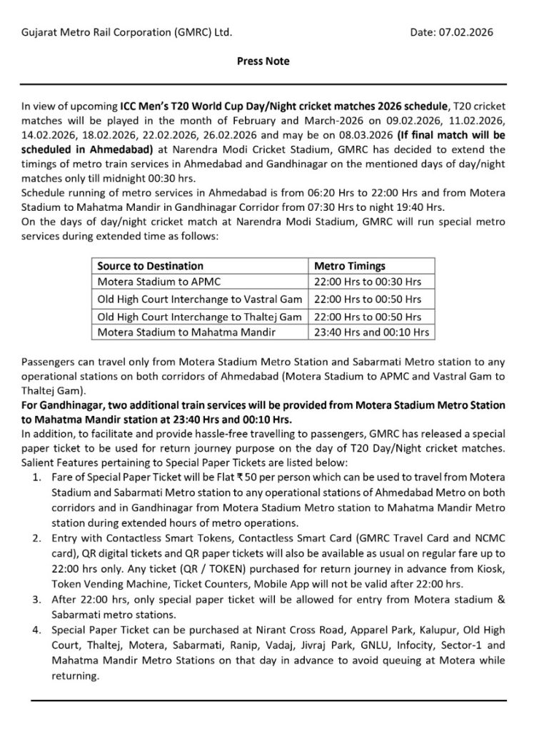 મુસાફરીને વધુ સરળ બનાવવા માટે રૂ. 50ની ફ્લેટ કિંમતે ‘સ્પેશિયલ પેપર ટિકિટ’ લોન્ચ કરવામાં આવી છે. રાત્રે 10:00 વાગ્યા પછી ટોકન અથવા ક્યૂઆર કોડ જેવી સામાન્ય ટિકિટો માન્ય રહેશે નહીં અને માત્ર આ પેપર ટિકિટ દ્વારા જ મુસાફરી કરી શકાશે. સ્ટેડિયમ પર પરત ફરતી વખતે લાંબી લાઈનોમાં ઊભા રહેવું ન પડે તે માટે મુસાફરો કાલુપુર, થલતેજ, રાણીપ અને મહાત્મા મંદિર સહિતના નિર્ધારિત સ્ટેશનો પરથી દિવસ દરમિયાન અગાઉથી જ આ સ્પેશિયલ ટિકિટ ખરીદી શકશે.