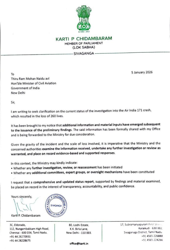 તેમણે રામ મોહન નાયડૂને પત્ર લખીને પૂછ્યું કે, શું નવી જાણકારીના આધારે તપાસ શરૂ કરવામાં આવી છે. કાર્તિ ચિદમ્બરમે 5 જાન્યુઆરીએ લખેલા પત્રમાં કહ્યું, હું એર ઈન્ડિયા 171 પ્લેન ક્રેશની વર્તમાન સ્થિતિ અંગે સ્પષ્ટીકરણ માંગું છું. આ દુર્ઘટનામાં 260 લોકોના મોત થયા હતા. મને જણવવામાં આવ્યું છે કે, પ્રારંભિક તપાસ બાદ વધુ કેટલીક જાણકારી અને જરૂરી ઈનપુટ સામે આવ્યા છે. આ જાણકારી મારી ઓફિસે ઔપચારિક રીતે શેર કરી છે અને આગળના કાર્યવાહી માટે મંત્રાલયને મોકલી રહ્યો છું.