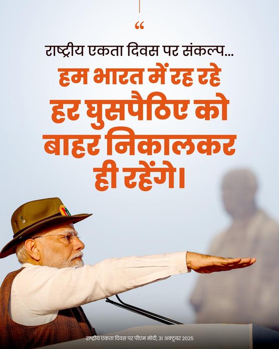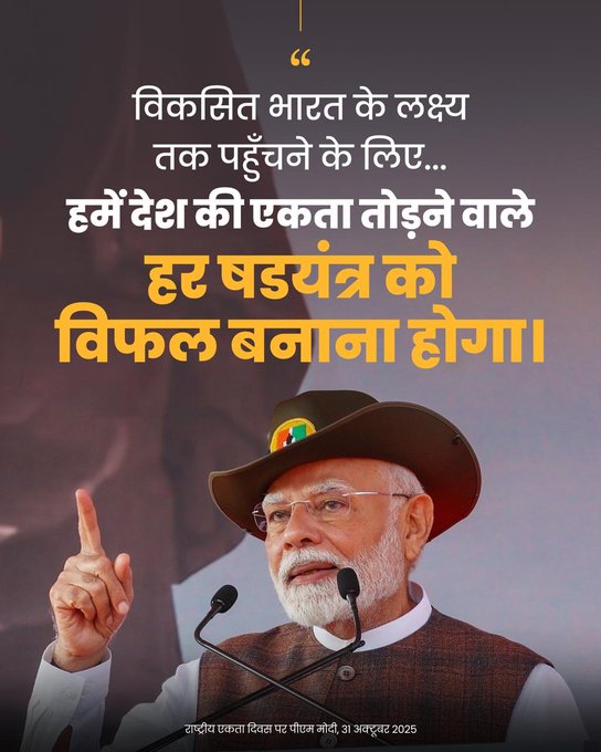 વડાપ્રધાન મોદીએ રાષ્ટ્રીય એકતા દિવસની ઉજવણીનો પ્રારંભ સ્ટેચ્યુ ઓફ યુનિટી ખાતે પાદપૂજન કરીને કર્યો હતો. ‘રાષ્ટ્ર પ્રથમ’ની ભાવના મજબૂત કરતા વડાપ્રધાને કહ્યું કે એકતા રાષ્ટ્ર અને સમાજના અસ્તિત્વનો મૂળ આધાર છે; જ્યાં સુધી સમાજમાં એકતા છે, ત્યાં સુધી રાષ્ટ્રની અખંડિતતા સુરક્ષિત છે. વિકસિત ભારતના લક્ષ્ય તરફ પહોંચવા માટે એકતા તોડનારા દરેક ષડયંત્રને એકતાની તાકાતથી વિફળ બનાવવું પડશે. ભારતની એકતાના ચાર મજબૂત આધારસ્તંભ છે: પ્રથમ, સાંસ્કૃતિક એકતા, જે હજારો વર્ષોથી રાજકીય પરિસ્થિતિઓથી અલગ ભારતને એક ચેતના રાષ્ટ્ર બનાવે છે.