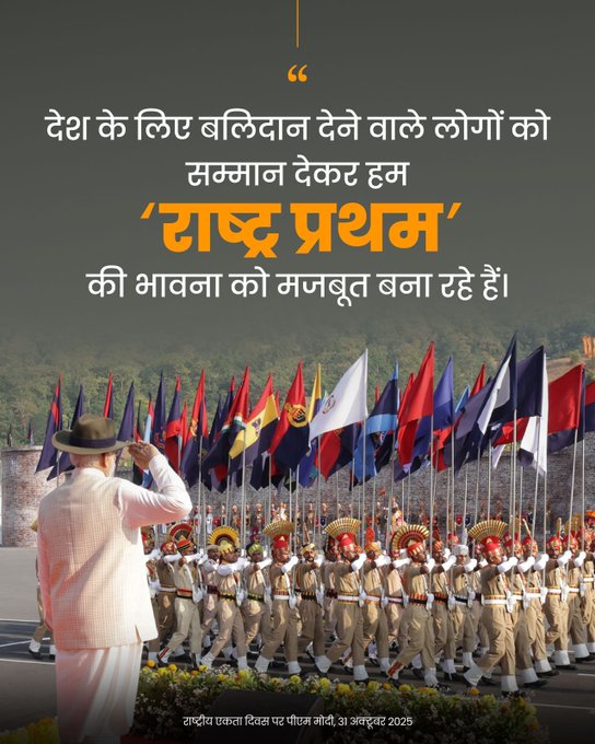 સરદાર પટેલની ભાવના યાદ કરતા વડાપ્રધાને કહ્યું કે તેઓને સૌથી વધુ ખુશી દેશ માટે કામ કરવામાં મળતી હતી, અને આજે પણ આ જ આહ્વાન છે – માતૃભારતીની સાધના દરેક દેશવાસીની સૌથી મોટી આરાધના છે. જ્યારે 140 કરોડ ભારતવાસીઓ એકસાથે ઊભા થાય છે, તો ખડકો પણ રસ્તો છોડી દે છે; જ્યારે એક સ્વરમાં બોલે છે, તો તે શબ્દો ભારતની સફળતાનો ઉદ્ઘોષ બને છે. આપણે વહેંચાશું નહીં, નબળા પડીશું નહીં; ‘એક ભારત, શ્રેષ્ઠ ભારત’ના સંકલ્પને મજબૂત કરી વિકસિત અને આત્મનિર્ભર ભારતના સપના પૂરા કરીશું. આ વેળાએ સાંસદો, ધારાસભ્યો, મુખ્ય સચિવ સહિતના ઉચ્ચ અધિકારીઓ સહિત નાગરિકો મોટી સંખ્યામાં ઉપસ્થિત રહ્યા હતા.