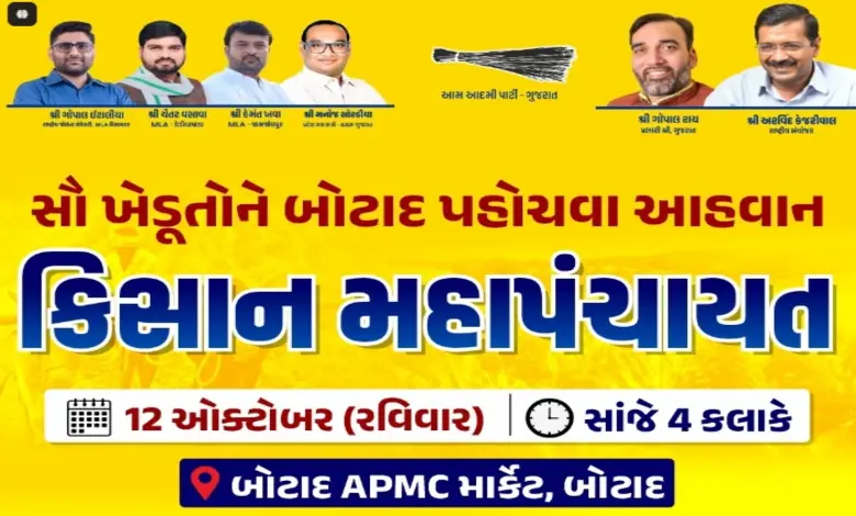 બોટાદમાં આવતીકાલે આમ આદમી પાર્ટીની કિસાન મહાપંચાયત યોજાશે