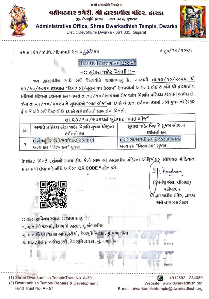 વહીવટદાર કચેરી દ્વારા આપવામાં આવેલી વિગતો અનુસાર, તા. ૨૩/૧૦/૨૦૨૫ ને બુધવાર, “ભાઈ બીજ” ના દિવસે શ્રી દ્વારકાધીશ મંદિરમાં દર્શનના સમયમાં મહત્વનો ફેરફાર કરવામાં આવ્યો છે. અગાઉ પ્રસિદ્ધ કરેલ જાહેર વિજ્ઞપ્તિ મુજબ, ભાઈ બીજના દિવસે મંગળા આરતીનો સમય સવારે ૦૭:૦૦ વાગ્યે નક્કી કરાયો હતો. જોકે, સુધારા જાહેર વિજ્ઞપ્તિ મુજબ, હવે મંગળા આરતીનો સમય અડધો કલાક વહેલો કરીને સવારે ૦૬:૩૦ વાગ્યે કરવામાં આવ્યો છે. આ સિવાયના દર્શનના અન્ય ક્રમ “નિત્ય ક્રમ” મુજબ જ રહેશે. શ્રી દ્વારકાધીશ મંદિરના વહીવટદાર કચેરી દ્વારા સર્વે વૈષ્ણવોને આ સુધારાને ધ્યાનમાં રાખીને દર્શનનો લાભ લેવા વિનંતી કરવામાં આવી છે.