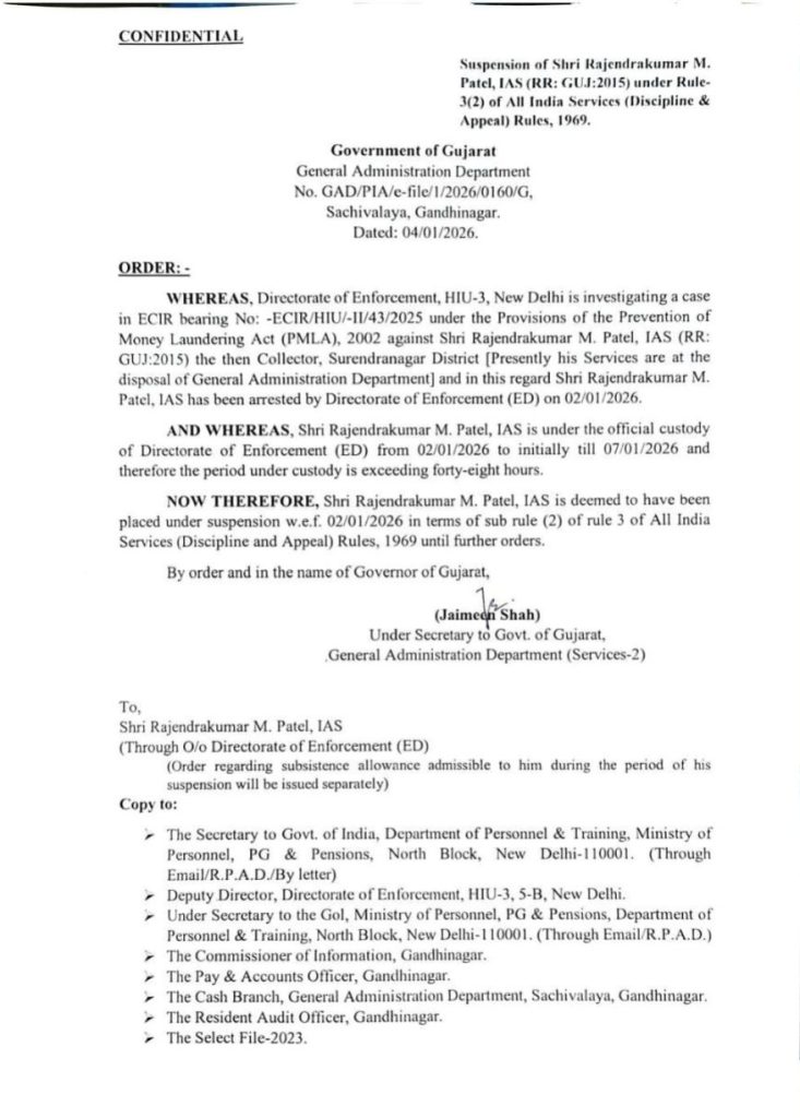 સુરેન્દ્રનગર: સુરેન્દ્રનગરના પૂર્વ કલેક્ટર મુદ્દે છેલ્લા કેટકાય દિવસથી સતત ચર્ચા ચાલી રહી છે. જમીન NA કરવા 10 કરોડથી વધુની લાંચ લીધાના આરોપમાં પૂર્વ કલેક્ટર રાજેન્દ્ર પટેલને સસ્પેન્ડ કરી દેવામાં આવ્યાં છે. 1500 કરોડના જમીન કૌભાંડમાં ઈડી દ્વારા સતત તપાસ કરવામાં આવી રહી છે. ઈડીએ સુરેન્દ્રનગર જિલ્લાના તત્કાલીન કલેક્ટર રાજેન્દ્રકુમાર પટેલની 2જી જાન્યુઆરીએ ધરપકડ કરી હતી. ધરપકડ બાદ હવે તંત્ર દ્વારા વધુ કાર્યવાહી કરવામાં આવી અને રાજેન્દ્ર પટેલને સસ્પેન્ડ કરી દેવામાં આવ્યાં છે.