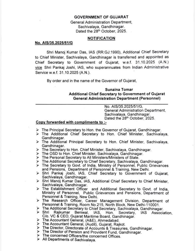ગુજરાત સરકારે વહીવટી તંત્રમાં મોટો ફેરફાર કરતાં, મુખ્ય પ્રધાનના મુખ્ય સચિવ તરીકે 1990ની બેચના આઈએયએસ અધિકારી મનોજ કુમાર દાસને રાજ્યના નિયુક્ત કર્યા છે. આ નિયુક્તિ 31 ઓક્ટોબર 2025થી અમલમાં આવશે કે જ્યારે વર્તમાન મુખ્ય સચિવ પંકજ જોશી નિવૃત થશે. ઉલ્લેખનીય છે કે મનોજ કુમાર દાસ વર્તમાન મુખ્ય સચિવ પંકજ જોશીનું સ્થાન લેશે, જેઓ 31 ઓક્ટોબર 2025ના રોજ ભારતીય વહીવટી સેવામાંથી નિવૃત્ત થઈ રહ્યા છે.