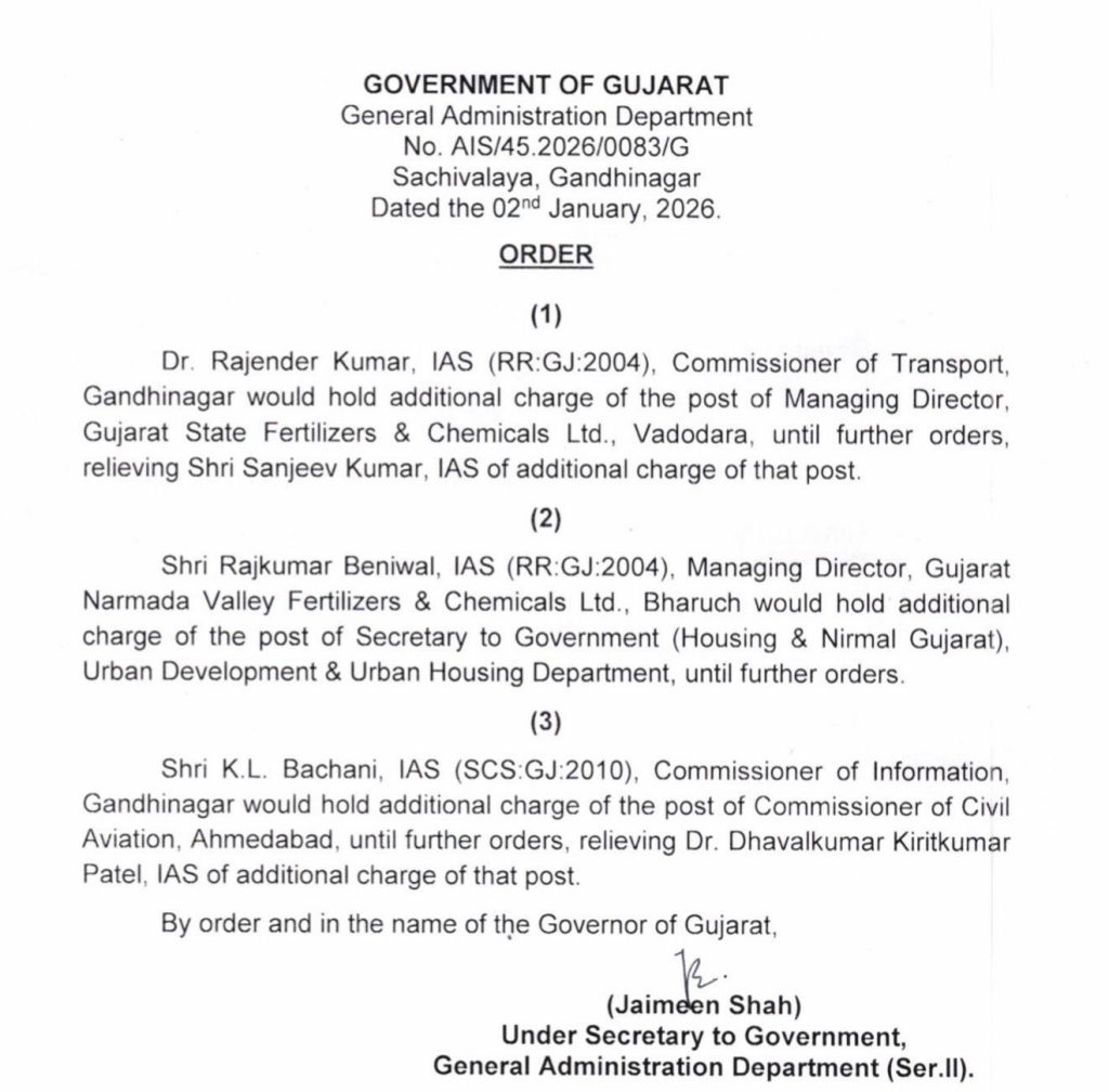 ગાંધીનગરઃ રાજ્ય સરકાર દ્વારા ત્રણ આઈએએસ અધિકારીને વધારાનો ચાર્જ સોંપવામાં આવ્યો હતો. તાજેતરમાં ટ્રાન્સપોર્ટ કમિશનર તરીકે બદલી થઈ છે તેવા ડો. રાજેન્દ્ર કુમારને વડોદરાના સરકારી કંપની ગુજરાત સ્ટેટ ફર્ટિલાઈઝર્સ એન્ડ કેમિકલ્સ લિમિટેડના મેનેજિંગ ડિરેકટરની જવાબદારી સોંપવામાં આવી છે.