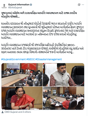 ગાંધીનગરઃ વડા પ્રધાન નરેન્દ્ર મોદીની પ્રેરણાથી ભારત સરકારની રાષ્ટ્રીય આપત્તિ વ્યવસ્થાપન સત્તામંડળ તથા ગુજરાતના મુખ્ય પ્રધાન ભૂપેન્દ્ર પટેલના માર્ગદર્શન હેઠળ ગુજરાત રાજ્ય આપત્તિ વ્યવસ્થાપન સત્તામંડળના સંયુક્ત ઉપક્રમે ગુજરાતમાં તેલ અને રાસાયણિક આપત્તિ વ્યવસ્થાપન માટે રાજ્ય સ્તરની મોકડ્રીલનું આયોજન કરવામાં આવ્યું છે.