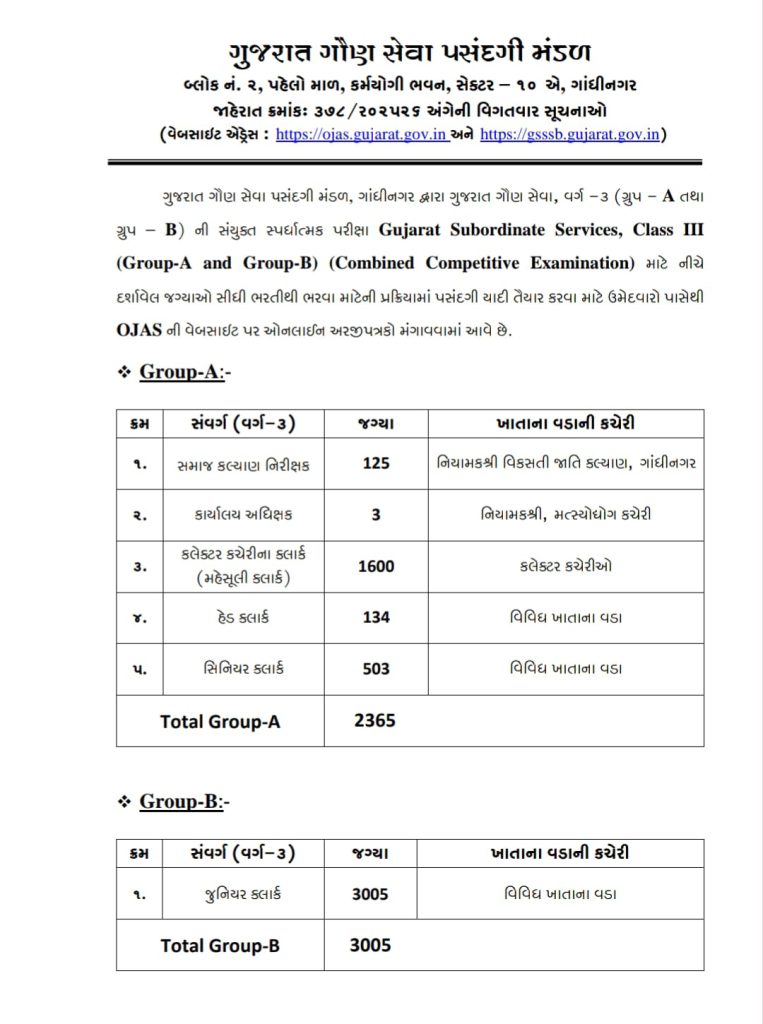 ગ્રુપ-એ માં સંવર્ગ (વર્ગ-3) હેઠળ સમાજ કલ્યાણ નિરીક્ષકની 125, કાર્યાલય અધિક્ષકની 3, કલેક્ટર કચેરીના ક્લાર્ક (મહેસૂલી કલાર્ક)ની 1600, હેડ કલાર્કની 134, સિનિયર કલાર્કની 503 જગ્યા મળી કુલ 2365 જગ્યા પર ભરતી કરવામાં આવશે. જ્યારે ગ્રુપ બીમાં સંવર્ગ (વર્ગ-3)માં જુનિયર કલાર્કની 3005 જગ્યા ભરવામાં આવશે.