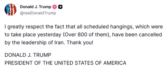 વ્હાઈટ હાઉસમાં મીડિયા સાથે વાત કરતા જણાવ્યું કે, “ઈરાને 800થી વધુ લોકોની ફાંસી રદ્દ કરી દીધી છે. હું આ વાતનું સન્માન કરું છું કે આનો રદ્દ કરવામાં આવ્યું છે.” ડૉનાલ્ડ ટ્રમ્પે ટ્રુથ સોશિયલ મીડિયા પ્લેટફોર્મ પર પોસ્ટ કરીને જણાવ્યું કે, “હું એ હકીકતનો ખૂબ જ આદર કરું છું કે ગઈકાલે જે તમામ નિર્ધારિત ફાંસી (800 થી વધુ) થવાની હતી, તેને ઈરાનના નેતૃત્વ દ્વારા રદ કરવામાં આવી છે. આભાર!”