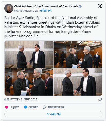 આમ, ખાલિદા ઝિયાના અંતિમસંસ્કારમાં એસ. જયશંકર અને સરદાર અયાઝ સાદિકની અનૌપચારિક મુલાકાત થઈ હતી. જેની તસવીર બાંગ્લાદેશની વચગાળાની સરકારના સલાહકાર મોહમ્મદ યુનુસે તેમના એક્સ હેન્ડલ પર શેર કરી છે.