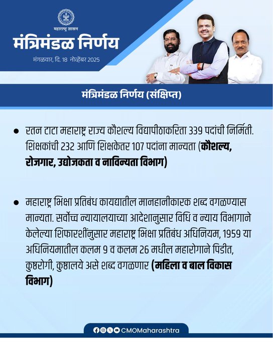 રતન ટાટા મહારાષ્ટ્ર રાજ્ય કૌશલ્ય યુનિવર્સિટી માટે 339 પદનું નિર્માણ કરવામાં આવશે. મંગળવારની બેઠકમાં 232 શિક્ષક અને 107 બિન-શૈક્ષણિક પદોને મંજૂરી આપવામાં આવી હતી.