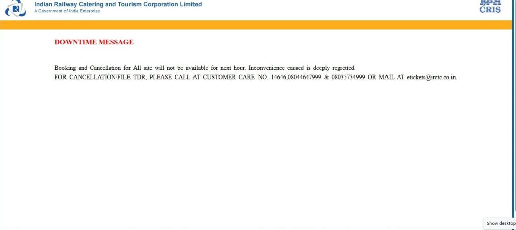IRCTCએ જણાવ્યા મુજબ, આગામી એક કલાક માટે બુકિંગ અને કેન્સલેશન બંધ રહેશે. કેન્સલેશન અથવા TDR ફાઇલ કરવા માટે, મુસાફરોને 08044647999 અને 08035734999 પર કૉલ કરવા અથવા etickets@rcte.co.in પર ઇમેઇલ કરવો.