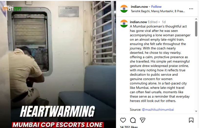 India.Now નામના એક ઇન્સ્ટાગ્રામ યુઝરે આ વીડિયો શેર કર્યો હતો અને લખ્યું હતું કે મોડી રાતના લગભગ ખાલી કોચમાં મુંબઈના એક પોલીસ કર્મચારી એકલી મહિલા મુસાફર સાથે જોવા મળ્યો હતો. તેણે આવું એટલા માટે કર્યું, જેથી તે આખી મુસાફરી દરમિયાન સુરક્ષિતતા અનુભવી શકે. કોચ લગભગ ખાલી હોવા છતાં પોલીસે કોચમાં રહેવાનું અને છેલ્લે સુધીની મુસાફરીમાં મહિલા પ્રવાસી સાથે શાંતિપૂર્વક અને રક્ષણાત્મક હાજરી આપી હતી.