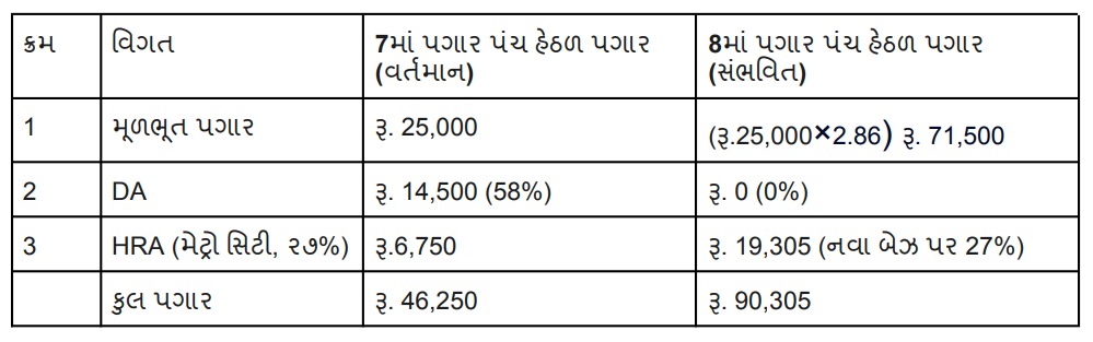 ફિટમેન્ટ ફેક્ટર 2.86 ના આધારે, એક કર્મચારીના વર્તમાન અને 8માં પગાર પંચ પછીના પગારની સંભવિત ગણતરી નીચેના કોષ્ટક મુજબ છે: