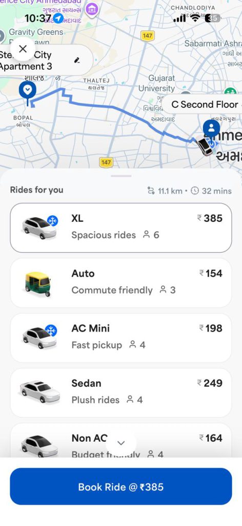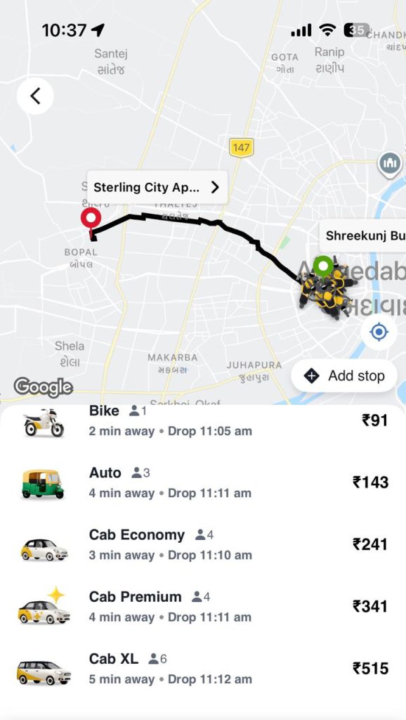 જ્યારે ભારત ટેક્સીમાં એટલા અંતરના 154 રૂપિયા જોવા મળી રહ્યા છે. જે દેખાડે છે કે ખાનગી અને સહકારીતા બંને એપના ભાવ લગભગ સમાન છે.