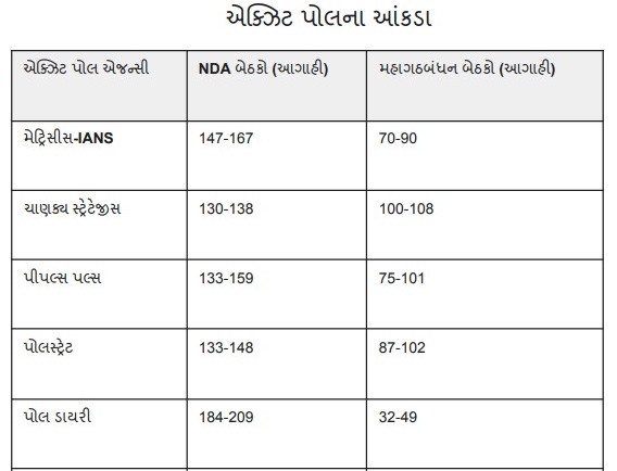 મતદાન પૂર્ણ થતાં જ વિવિધ એક્ઝિટ પોલ જાહેર થયા છે, જેમાં મોટા ભાગના પોલમાં NDA ગઠબંધનની જીતવાની અપેક્ષા વ્યક્ત કરી છે. મેટ્રિસીસ-IANS એક્ઝિટ પોલ મુજબ NDAને 48 ટકા અને મહાગઠબંધનને 37 ટકા મત મળવાની ધારણા છે. કેટલાક એક્ઝિટ પોલ નીચેના કોષ્ટકમાં આપેલ છે.