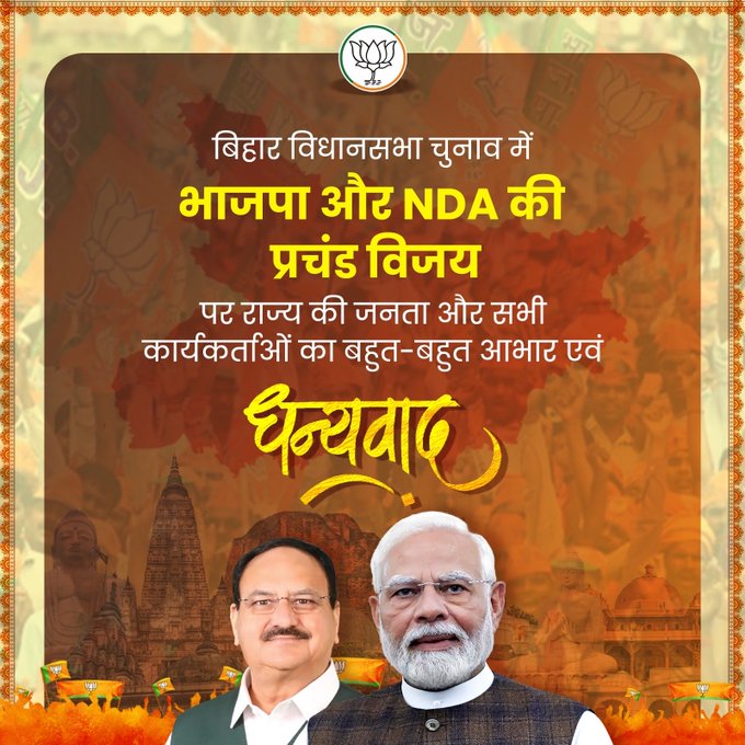 પટના: બિહાર વિધાનસભા ચૂંટણીમાં 2025 એનડીએ ગઠબંધનને પ્રચંડ વિજય મેળવ્યો છે. ભાજપે 90 થી વધુ બેઠકો જીતી છે અને જેડીયુ એ 80 થી વધુ બેઠકો જીતી છે. ચિરાગ પાસવાનના એલજીપી એ પણ 20 થી વધુ બેઠકો મેળવી છે. જ્યારે ભાજપ અને જેડીયુએ એનડીએ ના બહુમતીમાં મુખ્ય ભૂમિકા ભજવી છે. ત્યારે ચિરાગ પાસવાનની એલજેપીએ પણ આ વિજયને સુનિશ્ચિત કરવામાં મહત્વપૂર્ણ ભૂમિકા ભજવી છે.