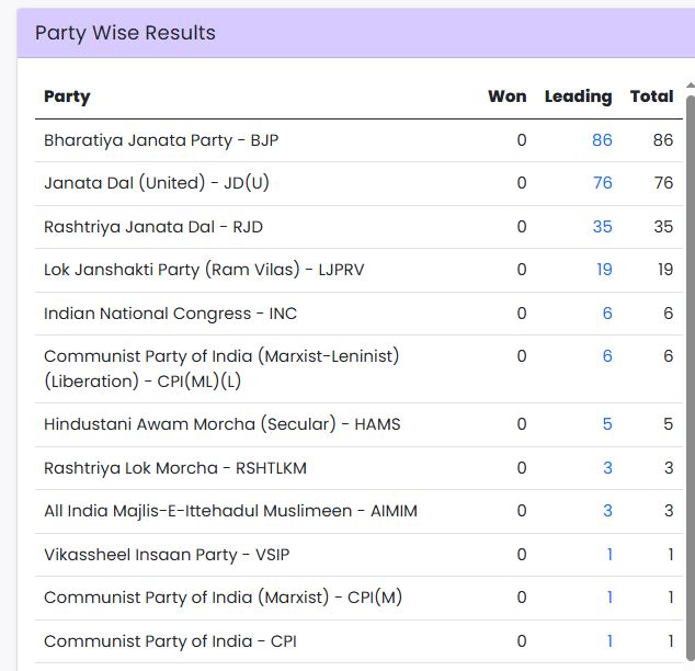 પટનાઃ બિહાર વિધાનસભા ચૂંટણીના પરિણામો આજે જાહેર થઈ રહ્યા છે. ચૂંટણી પંચની વેબસાઇટ મુજબ તમામ 243 સીટના વલણ સામે આવ્યા છે. જેમાં ભાજપ સૌથી મોટા પક્ષ તરીકે ઉભર્યો છે. ભાજપ 86, જેડીયુ 76, આરજેડી 33, લોક જનશક્તિપાર્ટી (રામવિલાસ) 22, કોંગ્રેસ 6, એઆઈએમઆઈએમ 3 સીટ પર આગળ ચાલી રહ્યા છે.