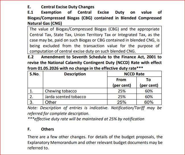 બજેટ પ્રસ્તાવ મુજબ, સરકારે તમાકુ ઉત્પાદનો પરની નેશનલ કેલામિટી કન્ટીજન્ટ ડ્યુટી (NCCD) માં સુધારો કર્યો છે, જેનો દર 1 મે, 2026 થી 25% થી વધારીને 60% કરવામાં આવ્યો છે. જોકે, ઉત્પાદકો અને ગ્રાહકો પર ટેક્સનો અસરકારક બોજ યથાવત રહેશે. કારણ કે એક્સાઈઝ ડ્યુટીના અન્ય ઘટકોમાં તે મુજબ ફેરફાર કરવામાં આવ્યા છે. આ ફેરફાર ચાવવાની તમાકુ, જરદા યુક્ત સુગંધિત તમાકુ અને સમાન ઉત્પાદનો પર લાગુ થશે, જે કિંમતોને અસર કર્યા વિના ટેક્સ વ્યવસ્થાપનમાં સુગમતા આપશે.