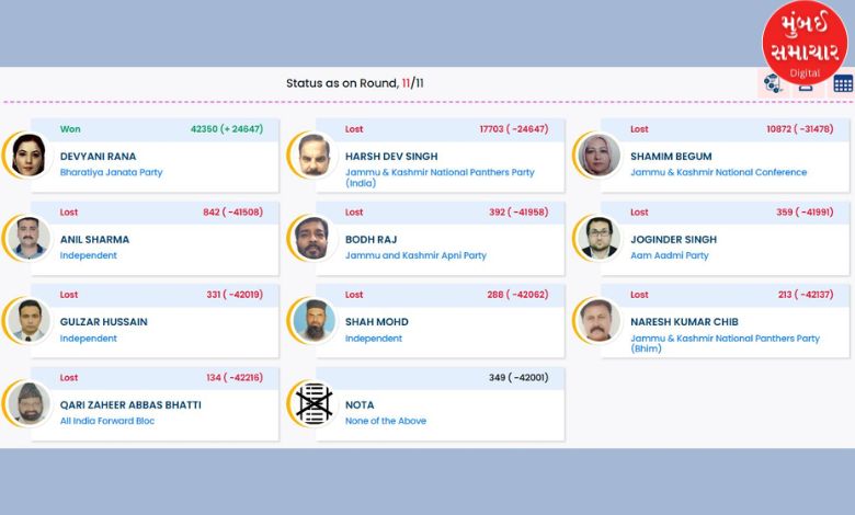 શ્રીનગરઃ બિહારની સાથે આજે કેટલાક રાજ્યોમાં યોજાયેલી પેટા ચૂંટણીના પરિણામો પણ જાહેર થઈ રહ્યા છે. જમ્મુ-કાશ્મીરની નગરોટા વિધાનસભા બેઠકની પેટાચૂંટણીમાં ભારતીય જનતા પાર્ટી એ ભવ્ય જીત હાંસલ કરી છે. ચૂંટણી પંચે પરિણામો જાહેર કરી દીધા છે, જેમાં ભાજપના ઉમેદવાર દેવયાની રાણા 24,647 મતોની જંગી સરસાઈથી જીતી ગયા છે.