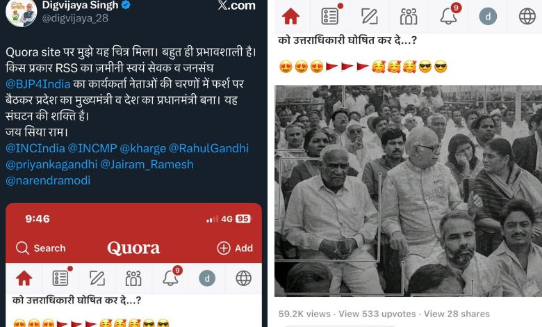 દિગ્વિજય સિંહે એક્સ પર એક ફોટો શેર કરીને લખ્યું કે, “Quora Site પર મને આ ફોટો મળ્યો. ઘણો પ્રભાવશાળી છે. કેવી રીતે RSSના જમીની સ્વયંસેવક તથા જનસંઘ(ભાજપ)ના કાર્યકર્તા નેતાઓના ચરણોમાં નીચે બેસીને રાજ્યના મુખ્ય પ્રધાન તથા દેશના વડા પ્રધાન બન્યા. આ સંગઠનની શક્તિ છે. જય સિયા રામ.”