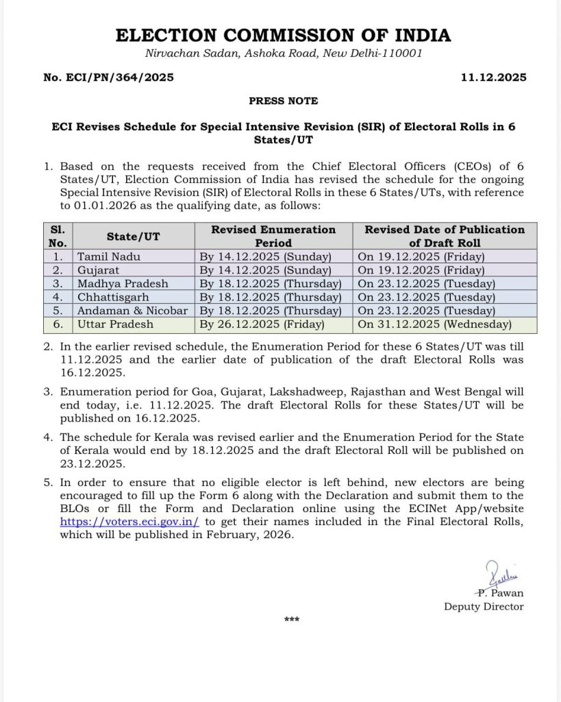 ચૂંટણી પંચ દ્વારા SIRની કામગીરીની મુદ્દત વધારી છે, જેમાં તમિલનાડુ, ગુજરાત, મધ્ય પ્રદેશ, છત્તીસગઢ, અંદમાન-નિકોબાર અને ઉત્તર પ્રદેશનો સમાવેશ થાય છે. અગાઉ તમિલનાડુ અને ગુજરાત માટે ડ્રાફ્ટ રોલ પબ્લિશ કરવાનીને તારીખ 14 ડિસેમ્બર હતી. જેને બદલીને 19 ડિસેમ્બર કરવામાં આવી છે. મધ્ય પ્રદેશ, છત્તીસગઢ અને આંદામાન-નિકોબારને ડ્રાફ્ટ રોલ પબ્લિશ કરવા માટે 18 ડિસેમ્બરનો સમય આપવામાં આવ્યો હતો. જેને વધારીને 23 ડિસેમ્બર કરવામાં આવ્યો છે. આ ઉપરાંત ઉત્તર પ્રદેશને ડ્રાફ્ટ રોલ પબ્લિશ કરવા માટે 26 ડિસેમ્બરનો સમય આપવામાં આવ્યો હતો. જેની મુદ્દત વધારીને 31 ડિસેમ્બર કરવામાં આવી છે.