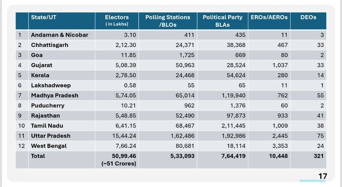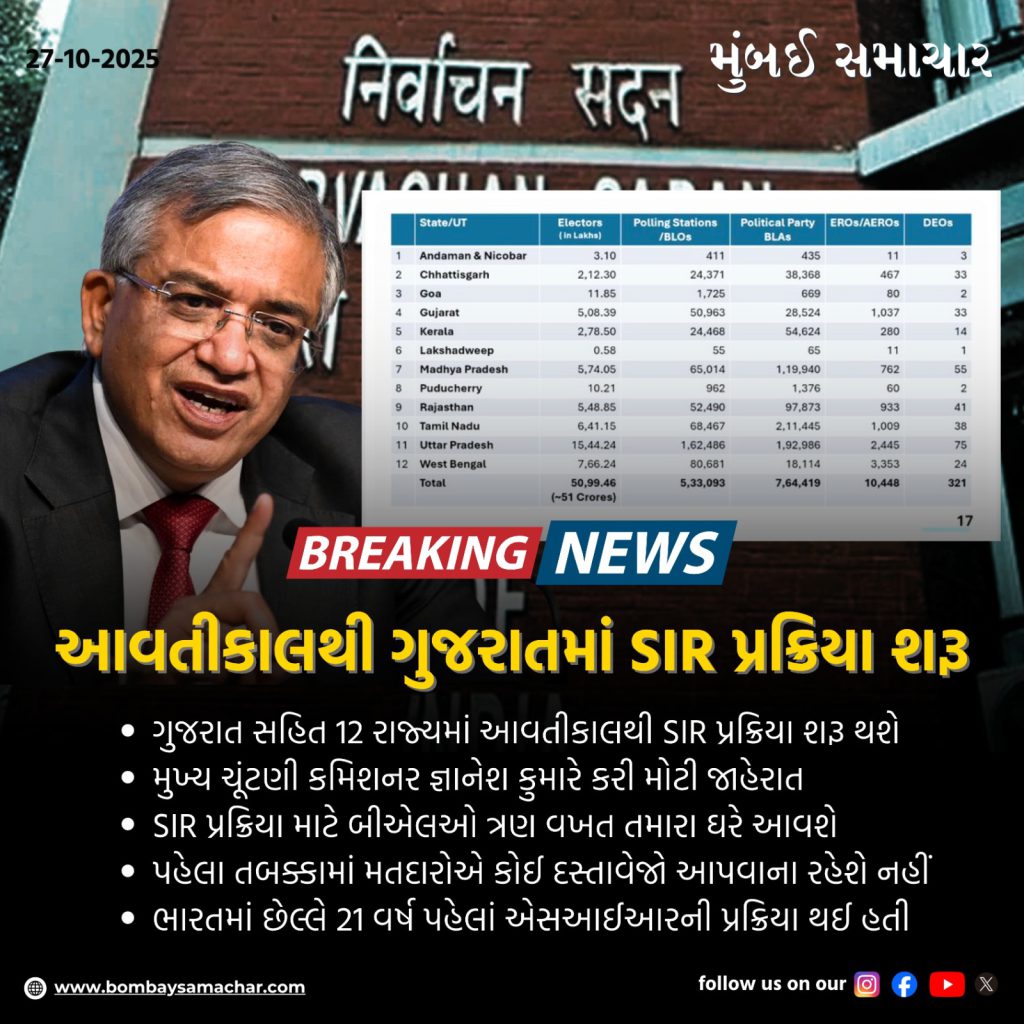 જેથી હવે બીજા ચરણમાં આ પ્રક્રિયા શરૂ કરવામાં આવશે. મહત્વની વાત એ છે કે, બીજા તબક્કામાં 12 રાજ્યમાં એસઆઈઆર પ્રક્રિયા હાથ ધરવામાં આવશે, આ યાદીમાં ગુજરાતનું નામ પણ સામેલ છે. જેથી આવતીકાલથી ગુજરાત સહિત 12 રાજ્યોમાં એસઆઈઆર પ્રક્રિયા શરૂ કરવામાં આવશે.