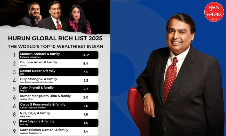 હુરુન ઈન્ડિયા રિચ લિસ્ટ-2025 અનુસાર રિલાયન્સ ઈન્ડસ્ટ્રીઝના ચેરમેન મુકેશ અંબાણી અને તેમના પરિવારની કુલ નેટવર્થ 9.55 લાખ કરોડ રૂપિયા હોવાનો જાવો કરવામાં આવે છે. આટલી સંપત્તિ સાથે તેઓ ભારતના સૌથી અમીર વ્યક્તિનો ખિતાબ પોતાના નામે કર્યો છે. જ્યારે આ મામલે 8.15 લાખ કરોડ રૂપિયા છે ગૌતમ અદાણી બીજા નંબરે આવે છે.