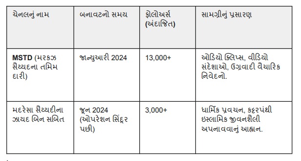 ઓપરેશન સિંદૂર બાદ જૈશ-એ-મોહમ્મદે ભારતીય યુવાનો સુધી પહોંચવા માટે એક નવું ડિજિટલ પ્લેટફોર્મ અપનાવ્યું છે. જેમા બે વોટ્સએપ ચેનલ શરૂ કરવામાં આવી છે. આ વોટ્સએપ ચેનલ પર કેવી માહિતી શેર કરવામાં આવે છે, તેની માહિતી નીચેના કોષ્ટક પ્રમાણે છે.