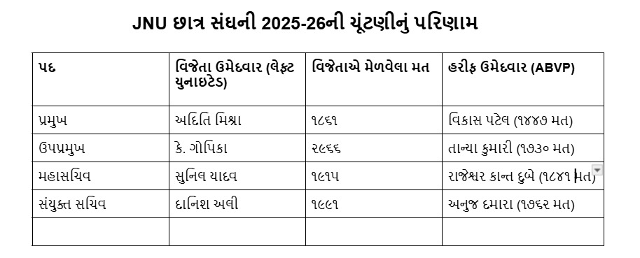 હવે જવાહરલાલ નેહરુ યુનિવર્સિટી વિદ્યાર્થી સંઘ (JNUSU)ની 2025-26 સત્ર માટેની ચૂંટણીના પરિણામો જાહેર થઈ ગયા છે, જેમાં લેફ્ટ યુનાઇટેડ પાર્ટીએ શાનદાર પ્રદર્શન કરીને પ્રમુખ પદ સહિત ચારેય મુખ્ય પદો પર વિજય મેળવીને ક્લીન સ્વીપ હાંસલ કર્યો છે. લેફ્ટ યુનાઇટેડ (Left United) એ તમામ ચાર પદો પર ABVPના ઉમેદવારોને હરાવ્યા હતા. જવાહરલાલ નેહરુ યુનિવર્સિટી વિદ્યાર્થી સંઘ (JNUSU)ની 2025-26ની ચૂંટણીનું પરિણામ નીચેના કોષ્ટકમાં આપેલું છે.