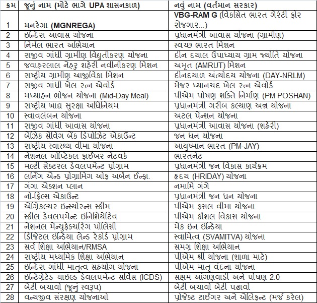 વિપક્ષનો દાવો છે કે છેલ્લા એક દાયકામાં કોંગ્રેસ સરકારની યોજનાના નામ મોદી સરકારે બદલ્યા છે. સરકારે લગભગ 28 જેટલી જૂની યોજનાના નામ બદલી નાખ્યા છે. આ યાદીમાં અનેક સીમાચિહ્નરૂપ યોજનાઓ સામેલ છે: